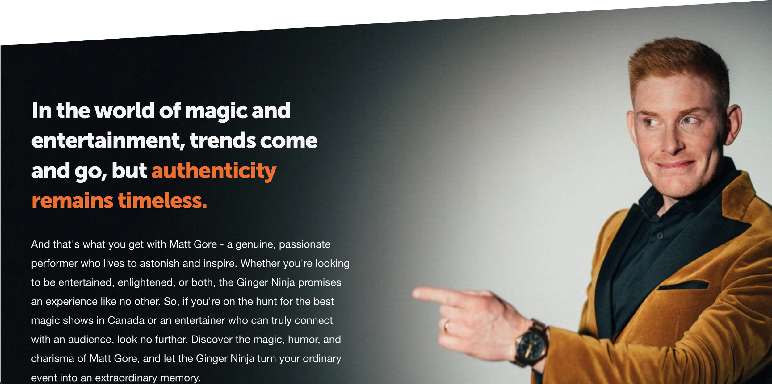 The creative direction for Matt Gore’s new site was driven by two objectives: convey the excitement of a live performance and build trust with event organisers looking to book a professional entertainer. The design features a bold orange accent — a distinctive nod to Matt’s trademark “Ginger Ninja” hair — balanced with clean typography and a black-and-white base palette to ensure legibility and visual impact. We curated high-energy performance imagery and embedded video to give visitors an immediate sense of Matt’s stage presence. Hero sections and headline placements were carefully chosen to ensure his value proposition is front and centre from the first scroll. The tone of the visuals and copy is upbeat, confident, and approachable, reflecting both his comedic style and his professionalism.
